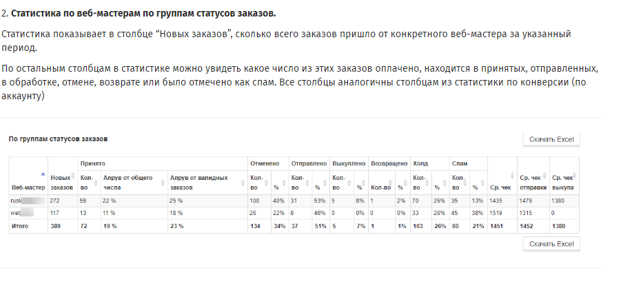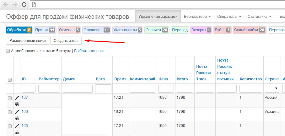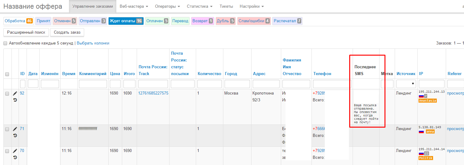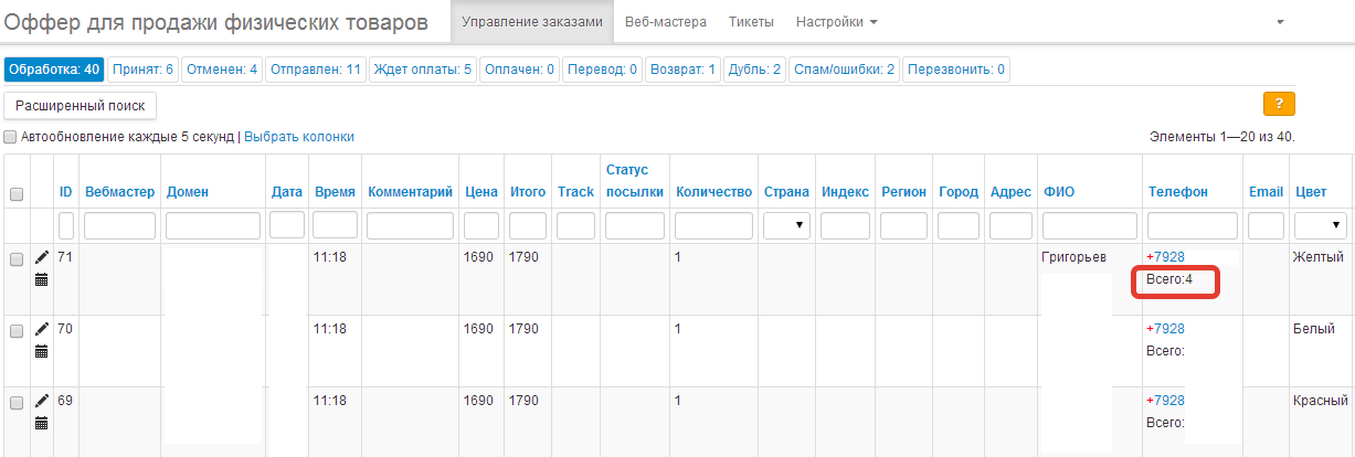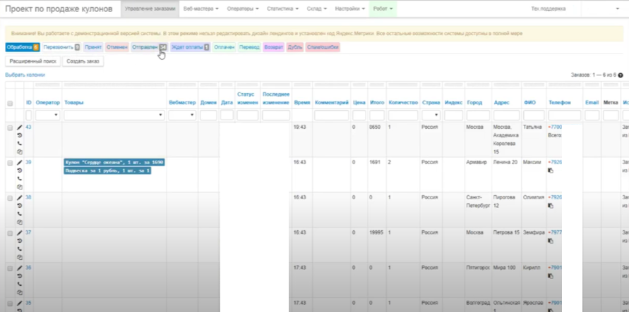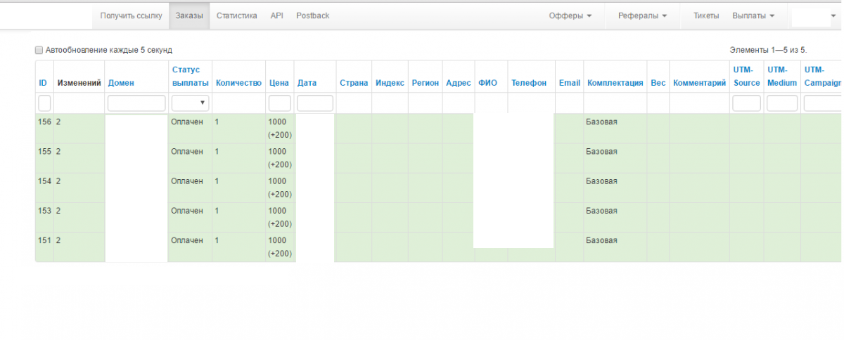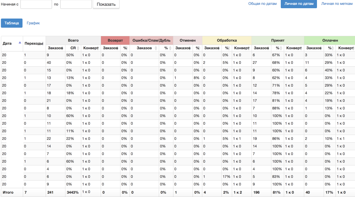 Все заявки и клиенты подробно отлеживаются в собственных личных кабинетах, и кабинете партнеров и владельца партнерки.